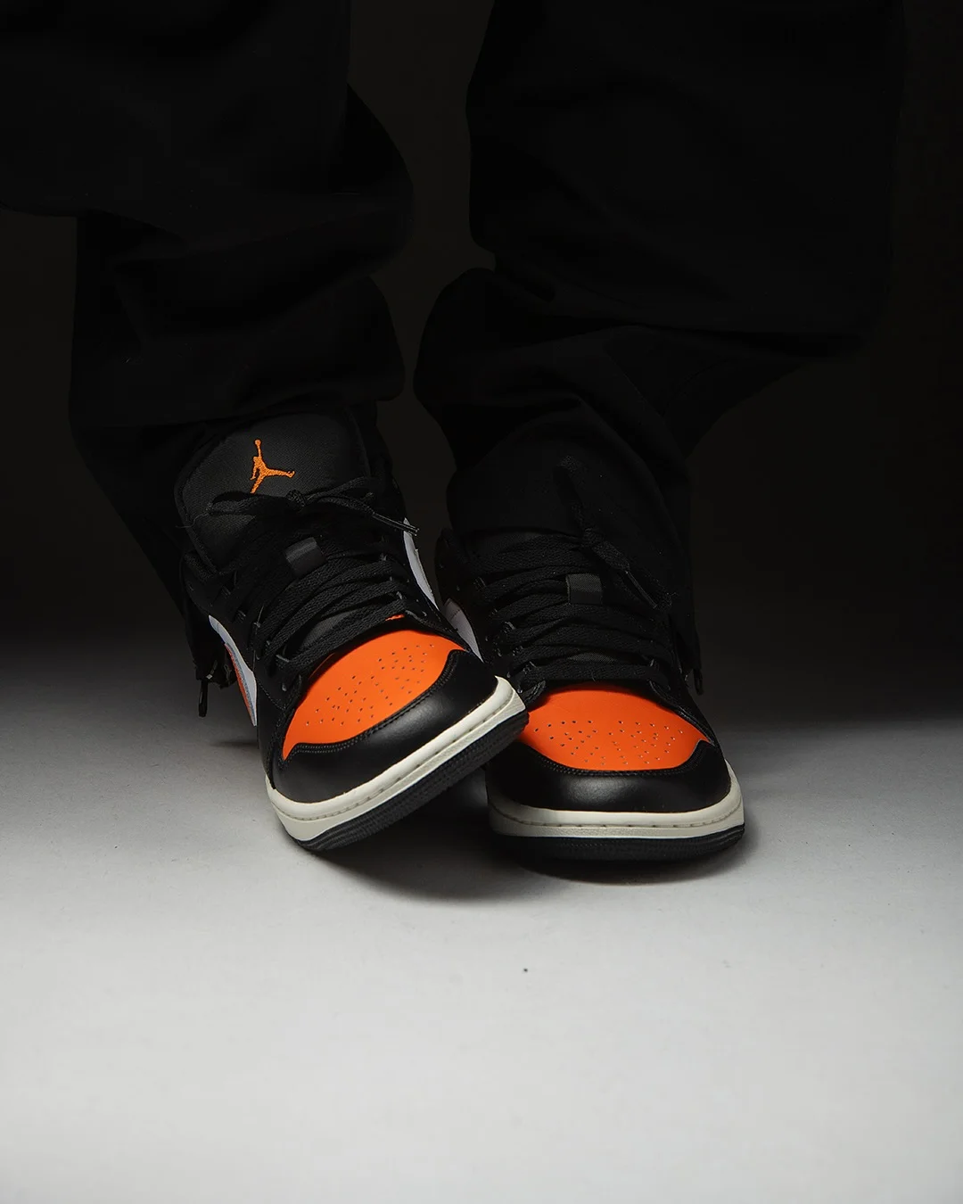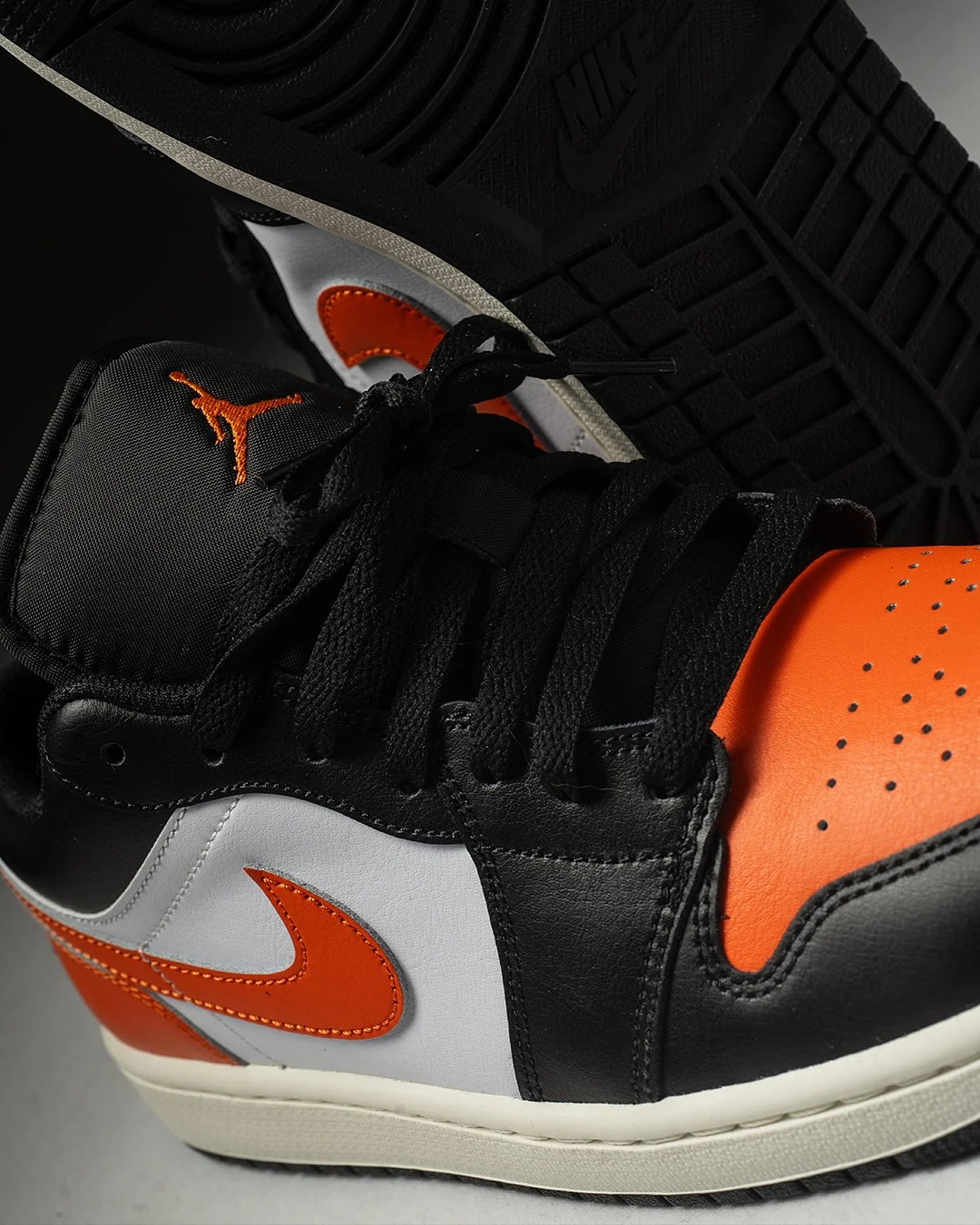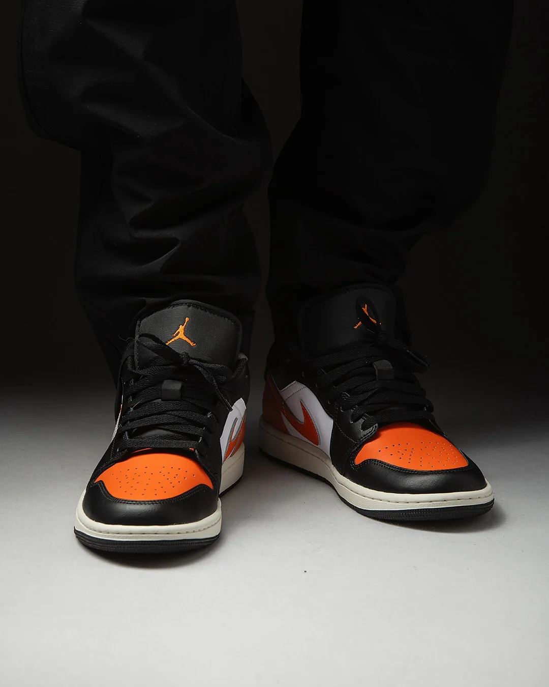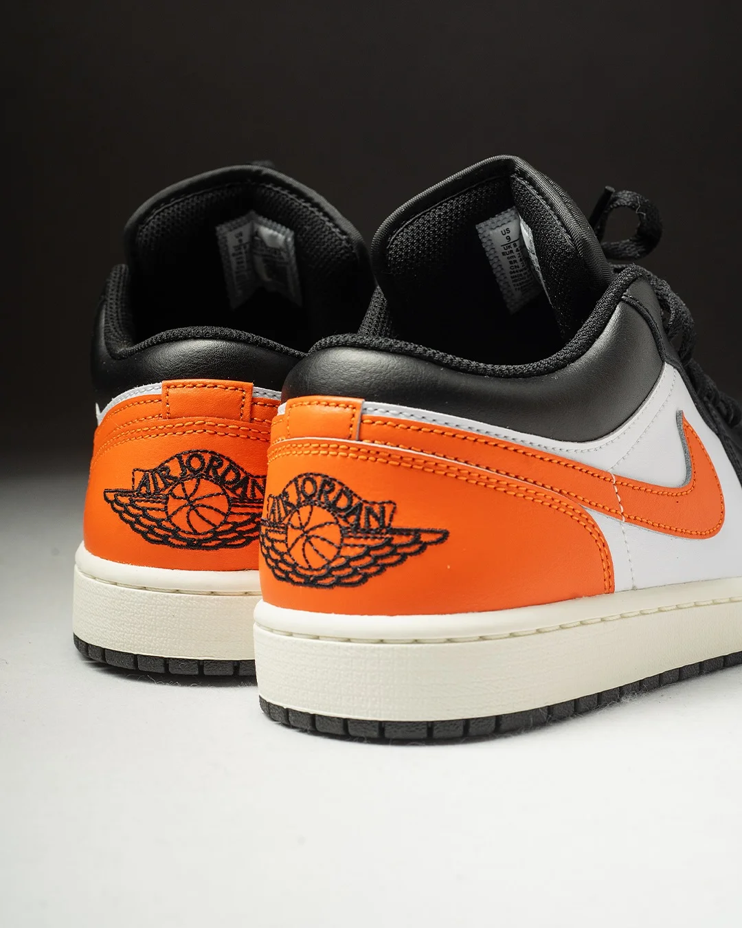 Air Jordan 1 Low "Shattered Backboard" именно такая. Оранжевый мысок на чёрном верхе, белая боковина, оранжевый свуш и пятка с крылатым логотипом Air Jordan — это цветовой блок, который Jordan Brand придумал ещё в 1985-м, и с тех пор он не устарел ни на день.