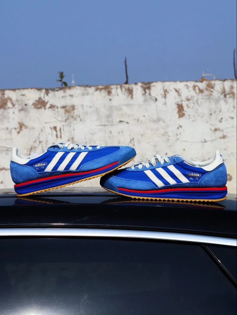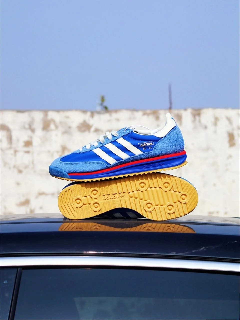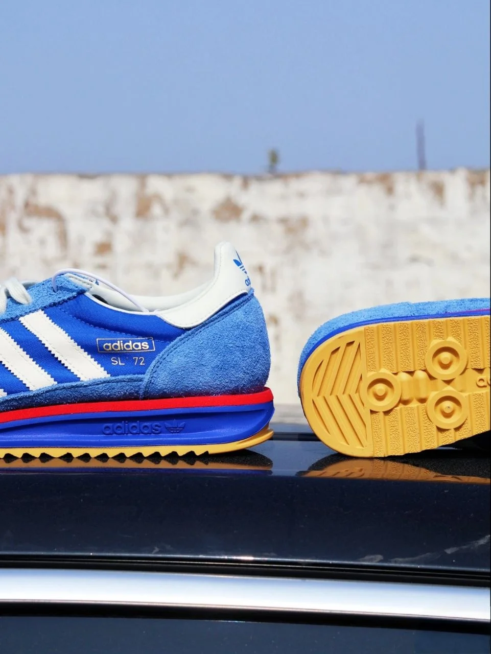 Синий + белые три полосы + красная деталь на подошве + гамовая резина снизу. Это не случайная палитра — именно в таком виде SL 72 дебютировал на Олимпиаде в Мюнхене в 1972 году. Пятьдесят лет спустя adidas вернул его практически без изменений — и это правильное решение. Когда форма безупречна, её не нужно переделывать.