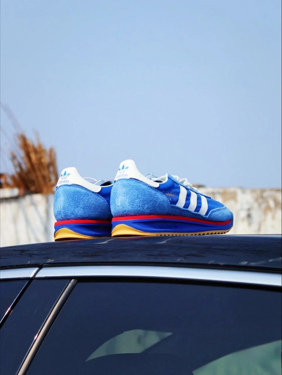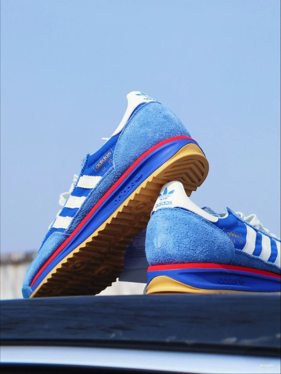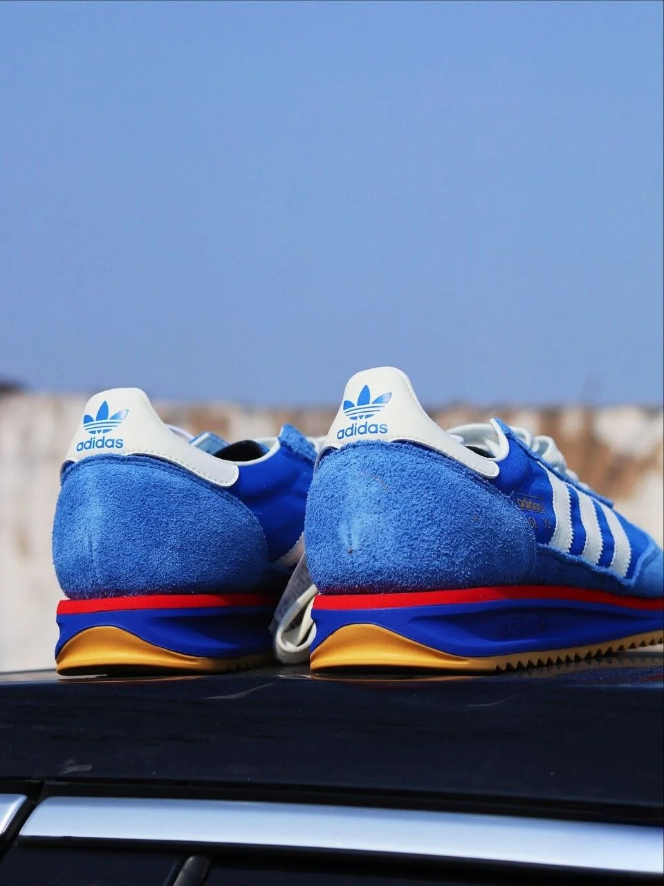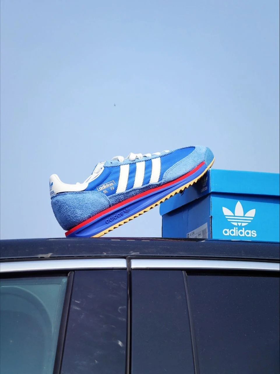 Синий + белые три полосы + красная деталь на подошве + гамовая резина снизу. Это не случайная палитра — именно в таком виде SL 72 дебютировал на Олимпиаде в Мюнхене в 1972 году. Пятьдесят лет спустя adidas вернул его практически без изменений — и это правильное решение. Когда форма безупречна, её не нужно переделывать.