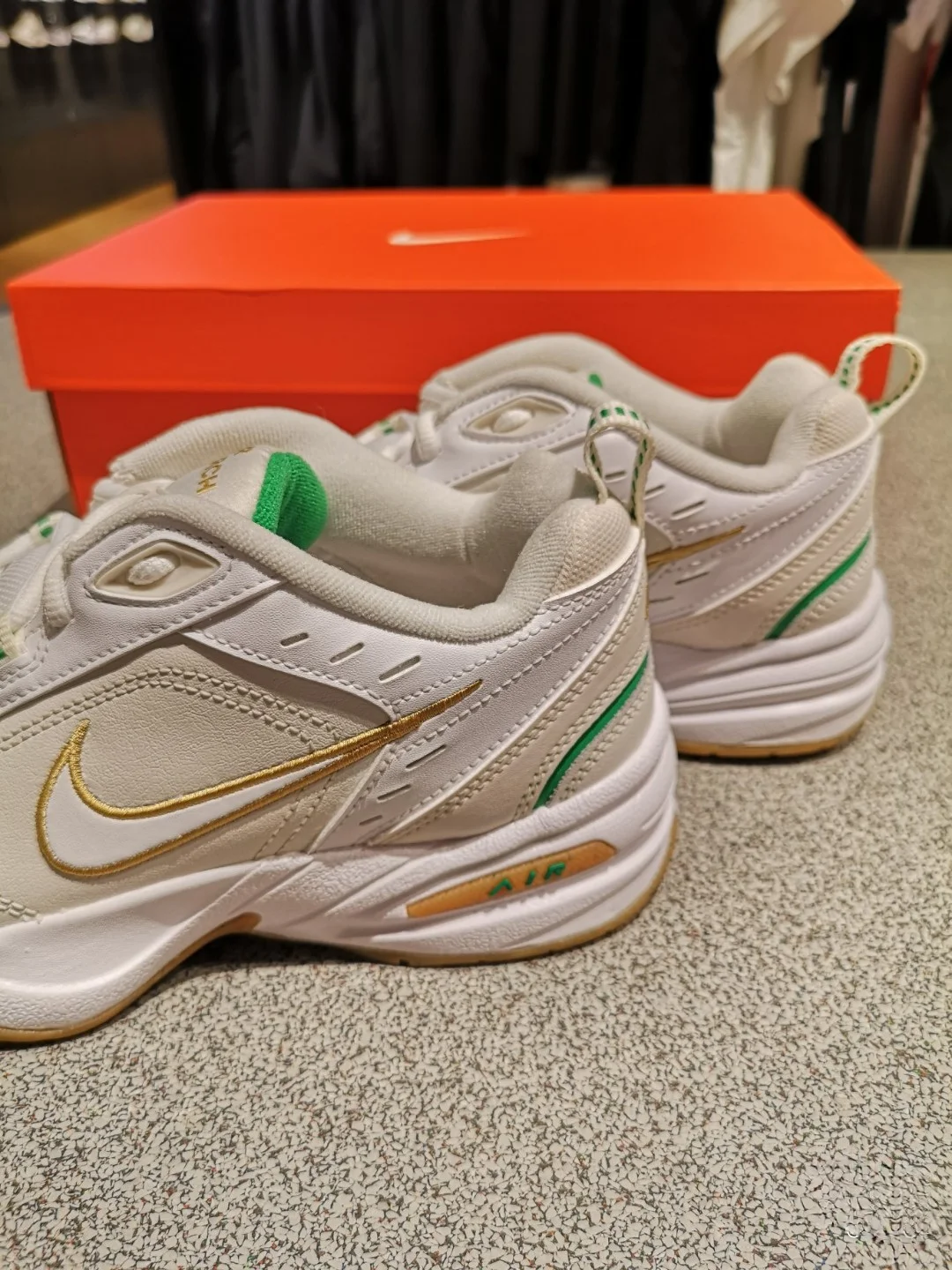 Обувь полностью выполнена в кремово-белом цвете, логотип Swoosh — в платиново-белом, а на язычке имеется золотистая надпись Air Monarch. Верхняя часть обуви изготовлена из кожи, синтетических материалов и текстиля, подошва — из Phylon, что обеспечивает легкую амортизацию, износостойкость и поддержку стопы. Прочная резиновая подошва отличается высокой устойчивостью к истиранию.