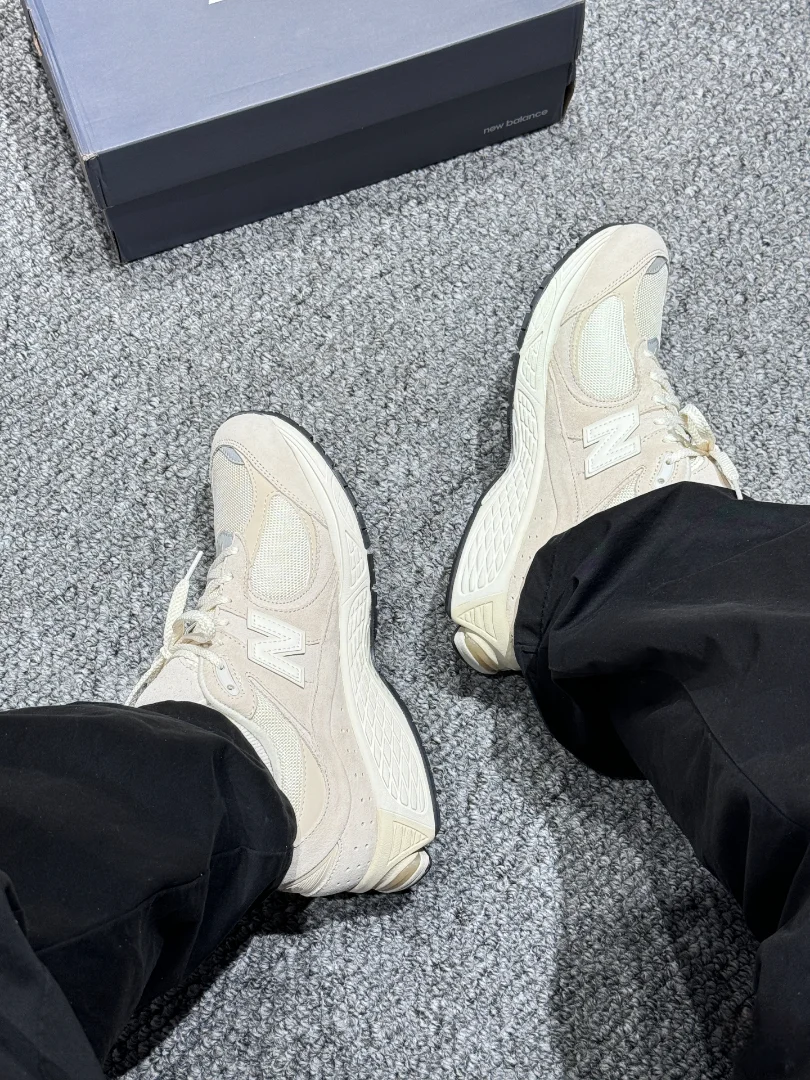 Модель кроссовок — классические New Balance 2002R, цвет — бежевый. Задняя часть украшена акцентами песочного оттенка, смотрится очень стильно.